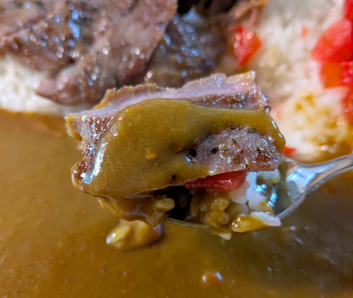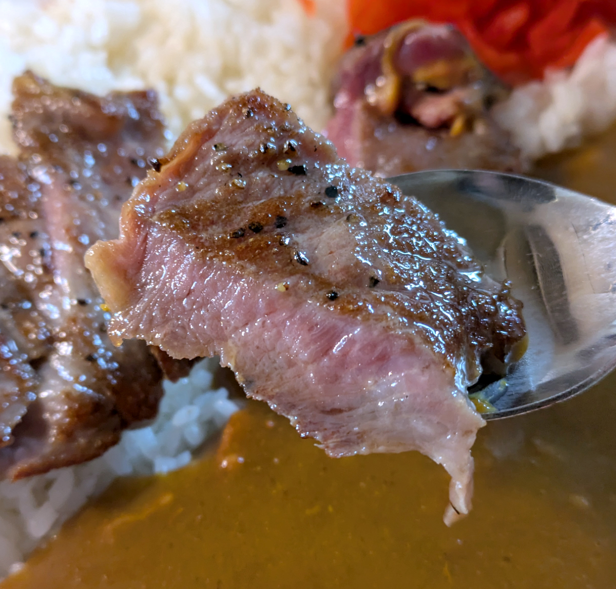表面にはこんがりと焼き目がつき、中はほんのりと赤みを帯びたミディアムレア。カレー屋であることを忘れるような、美しい焼き加減である。