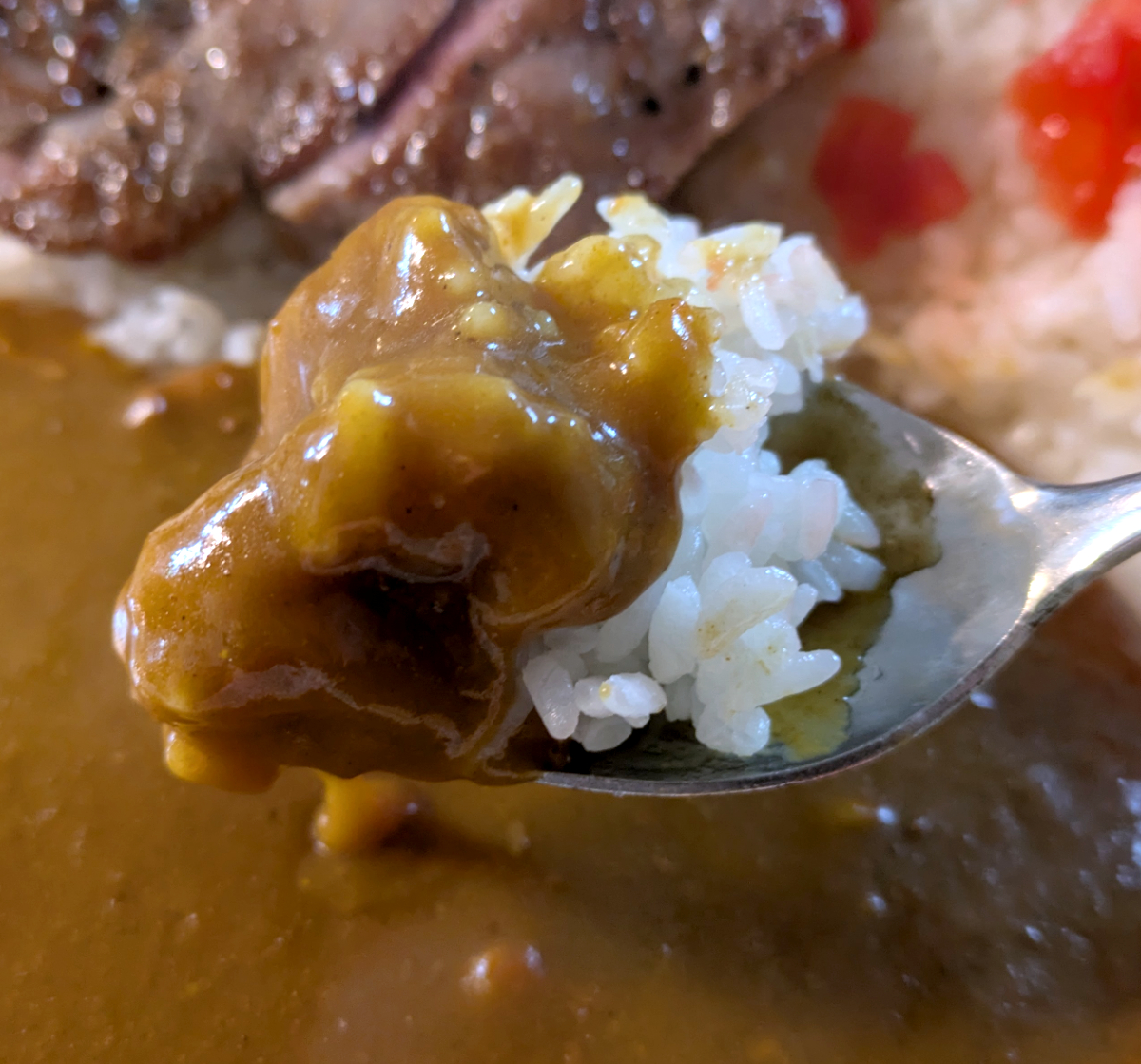 メニュー写真で「あまりにもデカいステーキ」が入っているレトルトカレーを開封して実物と比べた結果…え?