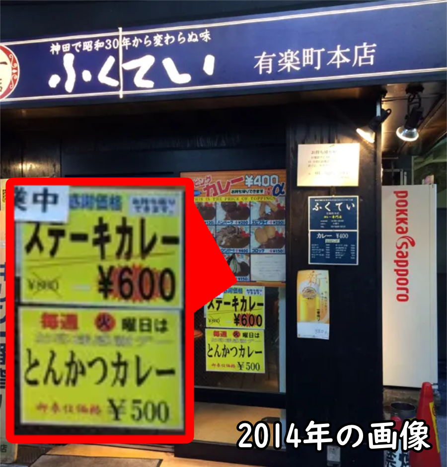 ふくていは昭和30年(1955年)に神田で創業したカレースタンドだ。70年もの長きにわたってカレーを提供し続ける老舗で、私が初めて訪問した2014年12月当時は、名物の「ステーキカレー」が600円。「とんかつカレー」は火曜日限定で500円だった。