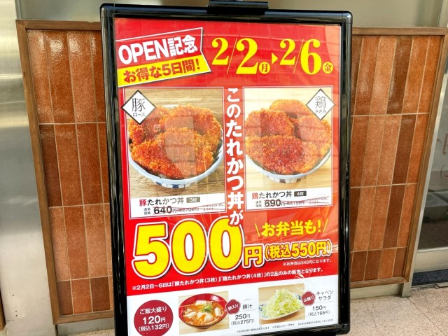 さて、それでは最後に開店記念キャンペーンについて触れておこう。オープン日の2月2日から6日までの5日間は、『豚たれかつ丼 3枚』と『鶏たれかつ丼 4枚』の2品がなんと税込550円で販売されるぞ!
