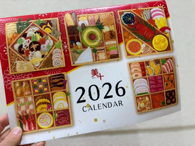 その風呂敷を開くと、おせちをモチーフにしたイラスト入りのカレンダーが登場。