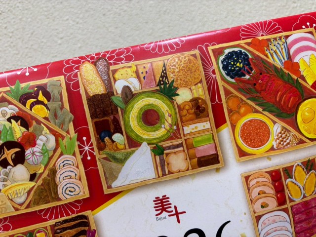中央には美十のお菓子で作られたおせちが描かれており、遊び心もあってかわいい。