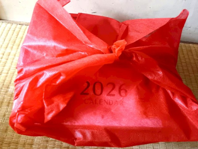 箱を開けると、中から現れたのは赤い風呂敷風の包み。簡易的ではあるものの、お正月らしい縁起の良さがきちんと演出されている。