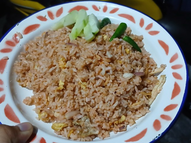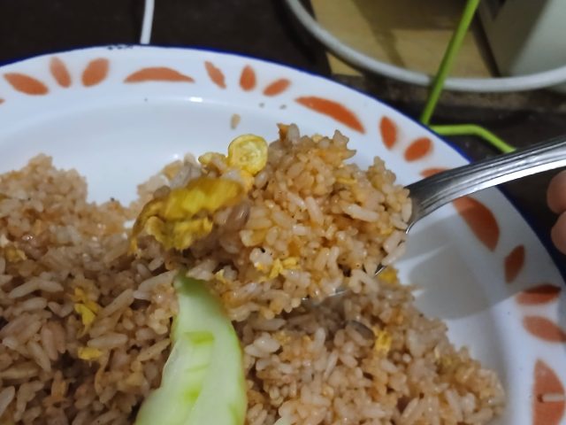 インドネシアだとね、こういう焼き飯が多いんだよね。トマトケチャップを使って赤く染まってるか、甘醤油を使ってちょっと黒く染まってるかの2パターンが多い。