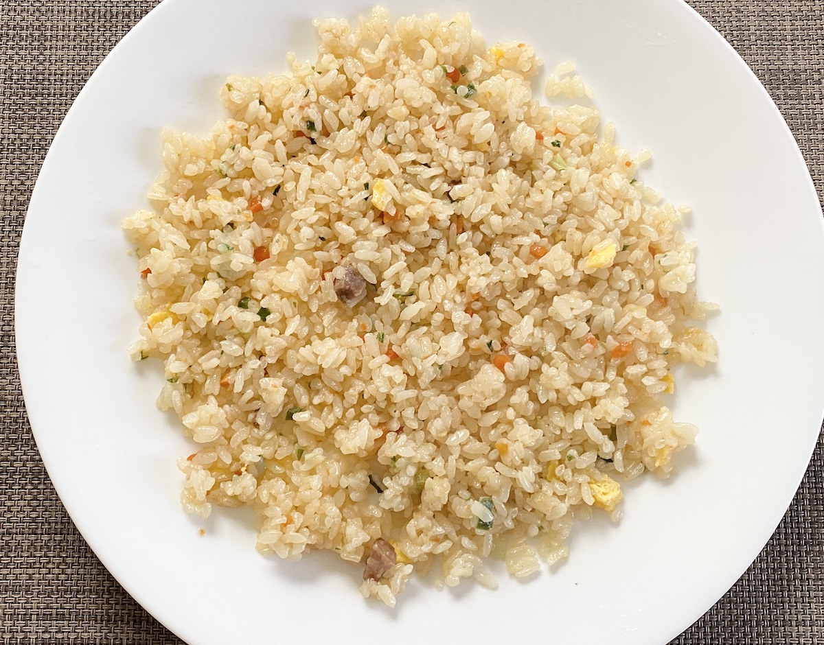 冷凍炒飯なのでレンチンして待つこと数分で完成。見た感じ、卵やチャーシューなど具材もしっかり入っている印象を受ける。