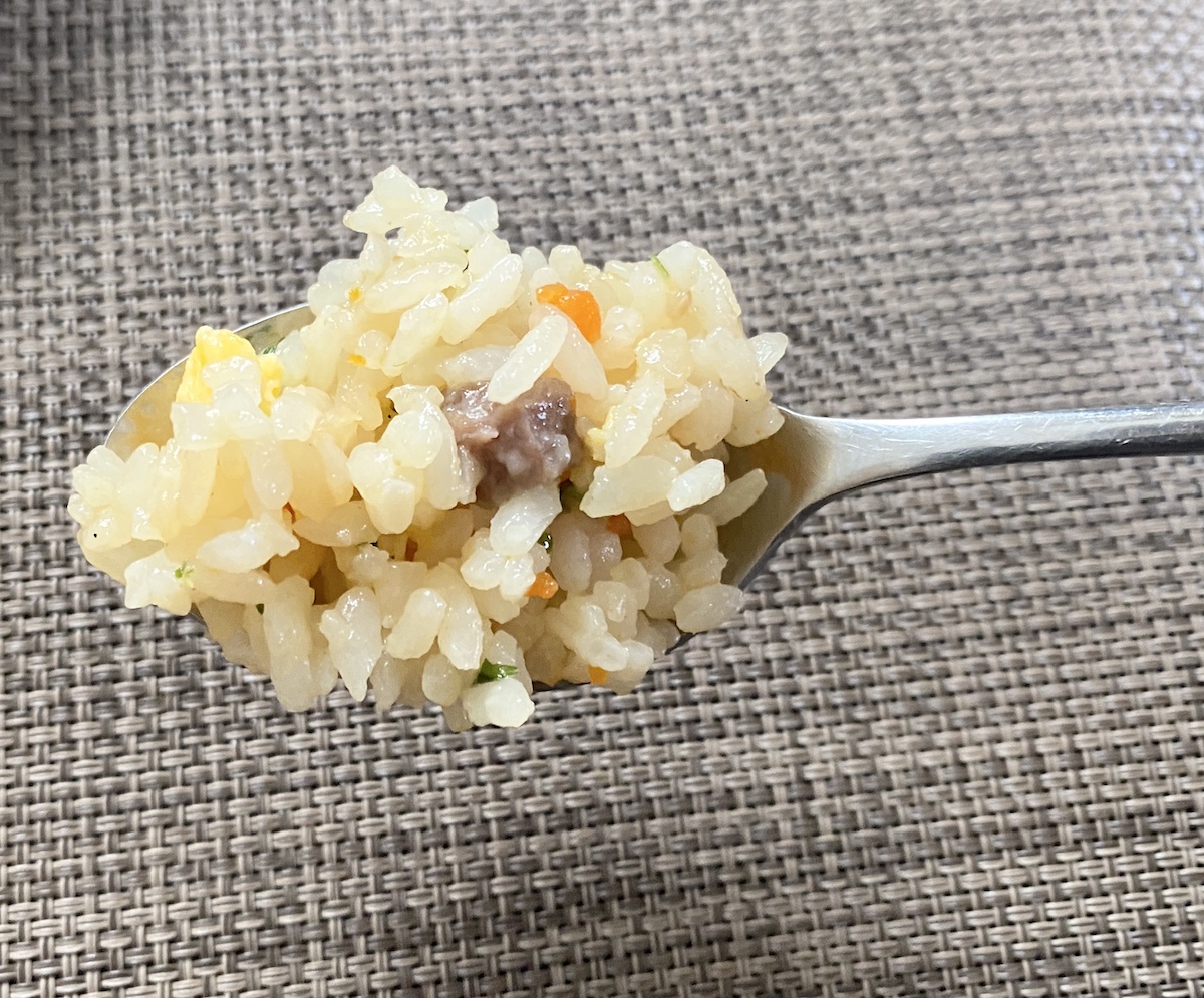 続いて「直火炒飯」の方も食べておこう。最近だと名前から盛り盛りに盛る商品も少なくないなか、ど真ん中ストレートで逆に好感を持てる。