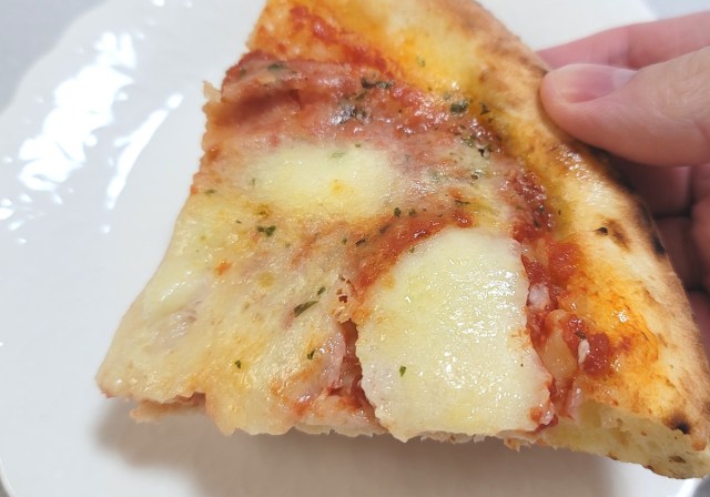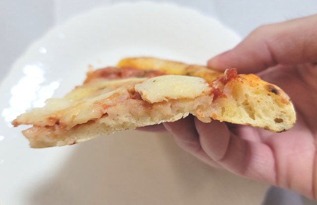 「価格対サイズ」のコストパフォーマンスだけで見るなら、世の中に多くあふれる冷凍食品のピザたちには引けを取りうるものの、店頭でのパワフルな加熱も手伝ってか、それらより専門店寄りのクオリティに数歩踏み込んでいるように感じる。