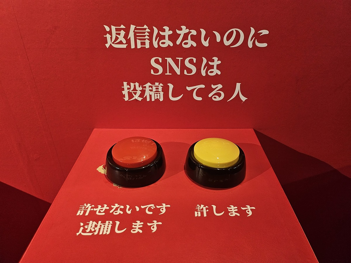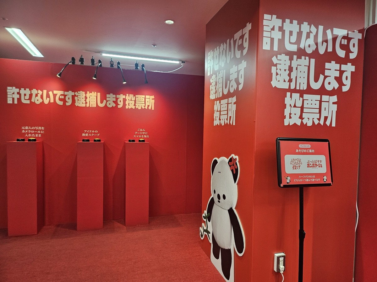 お題に対して許せるか許せないかを選ぶ「許せないです逮捕します投票所」などの展示が並ぶ。