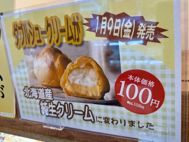 あらためて紹介しておこう。2026年1月に発売されたばかりの「ダブルシュークリーム 北海道純生クリーム(108円)」は、生乳のみで作った純生クリーム & うみたて卵で作った濃厚カスタードクリームによる贅沢な味わいが特徴らしい。