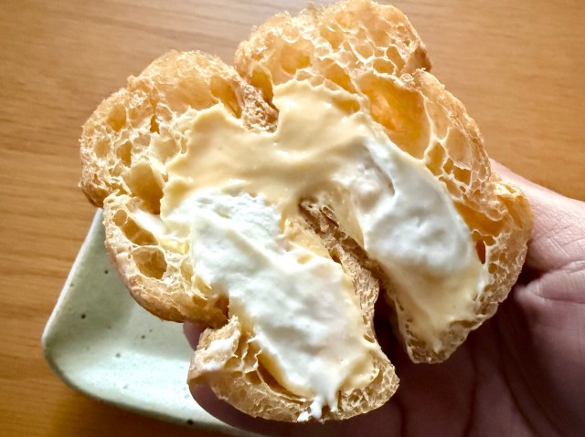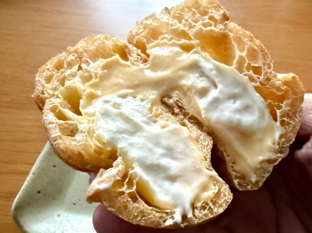 さて、パッケージから取り出したダブルシュークリームは、見た目・雰囲気ともに以前のものと変わらず。表面はサクッとしつつも、しっとりふんわり系の生地だ。では実際に食べてみると……