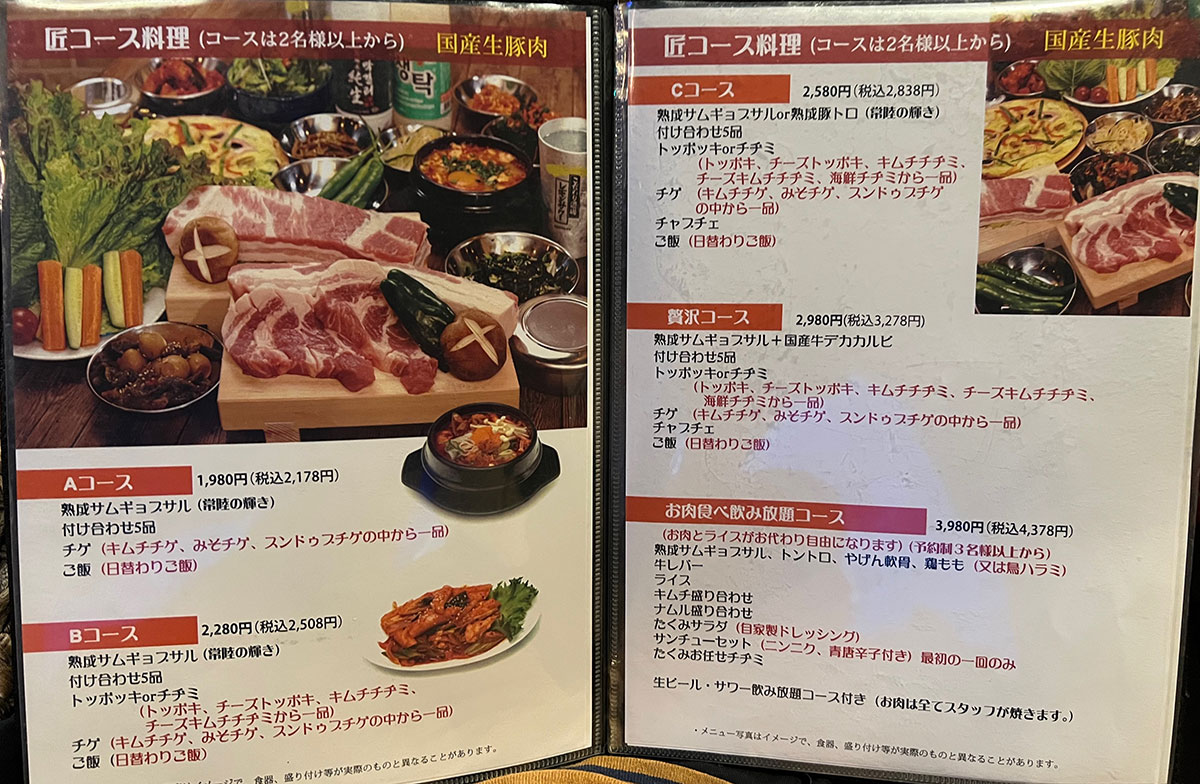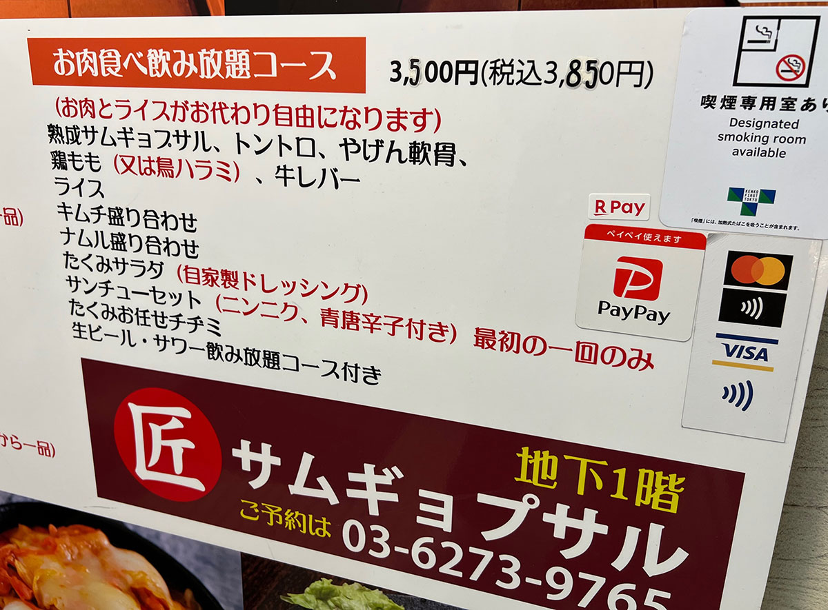 さて、先日。私は高田馬場で気になる韓国料理店(匠 生 サムギョプサル)を見つけた。表の看板に「食べ放題」とあり、メニューにサムギョプサルが入っていたから、今夜は韓国式焼肉でも堪能するかと思って入店。