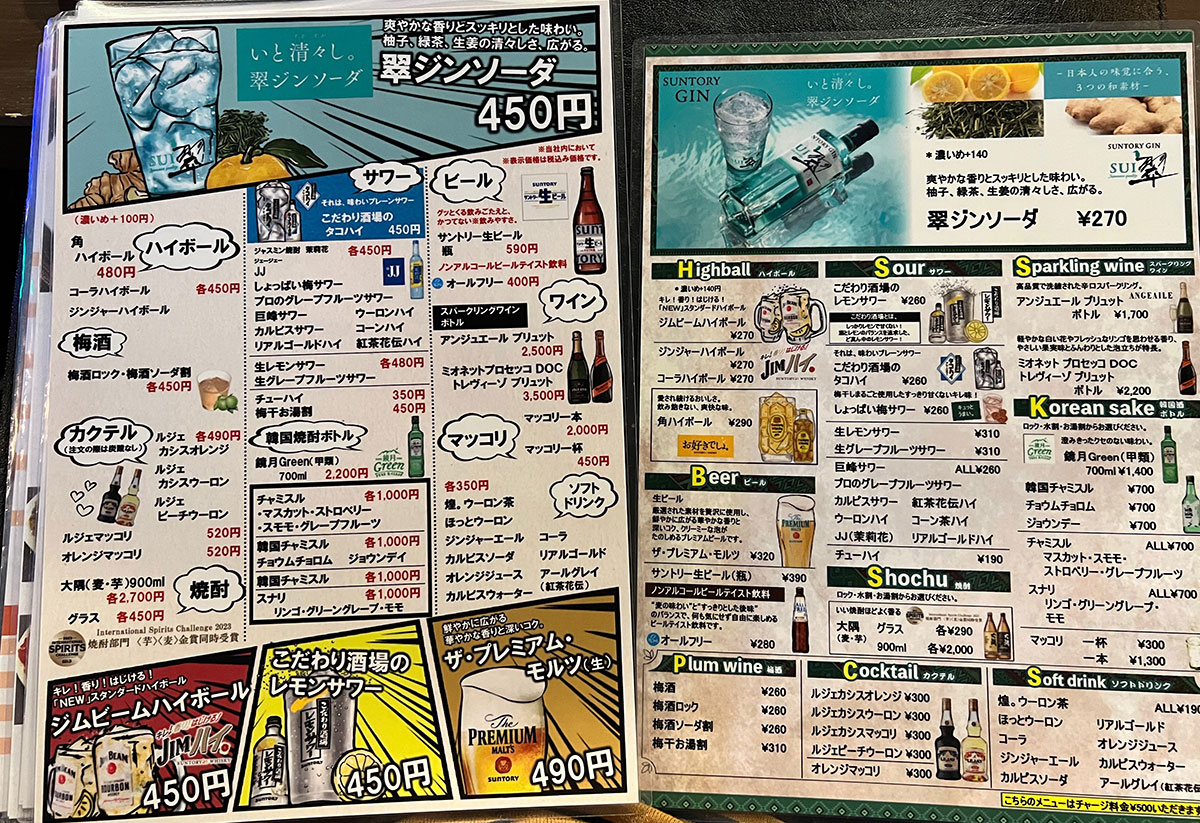 ▼ちなみに、ドリンクはチャージなし(左側)とチャージあり(右側、プラス500円)で価格が異なる。たとえば、サントリー瓶ビールはチャージなしだと590円だが、チャージありだと390円。飲む量によってお得な方を選べばいいので、これは親切設計!