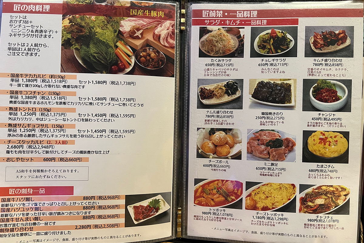 ▼メニューはこんな感じ。熟成サムギョプサル(150g)が1375円で、国産牛デカカルビが単品1518円といったところ。単品メニューも充実している