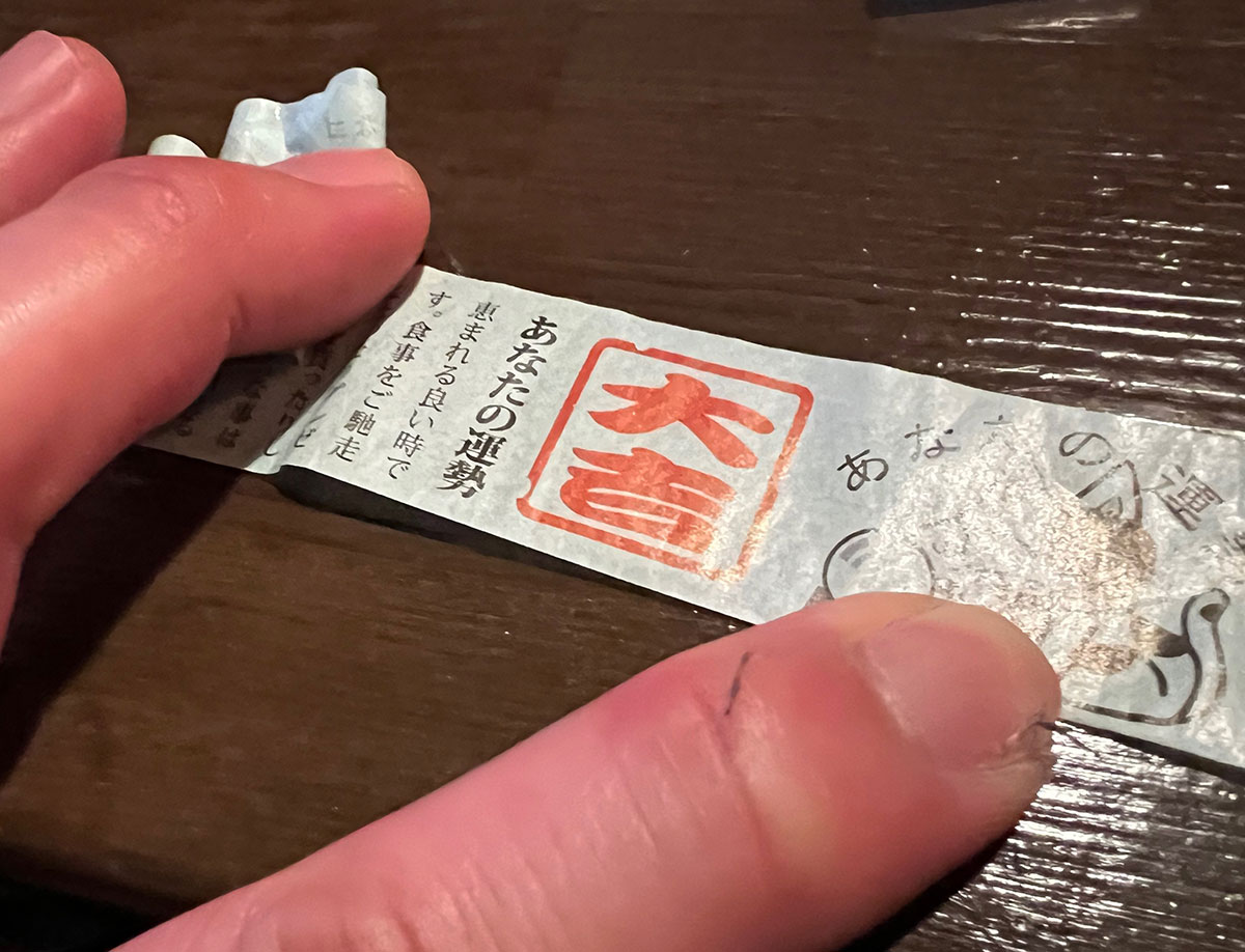 せっかくだから、やってみよう。100円を投入し、自分の誕生月のところを引くと、あろうことか「大吉」だった。