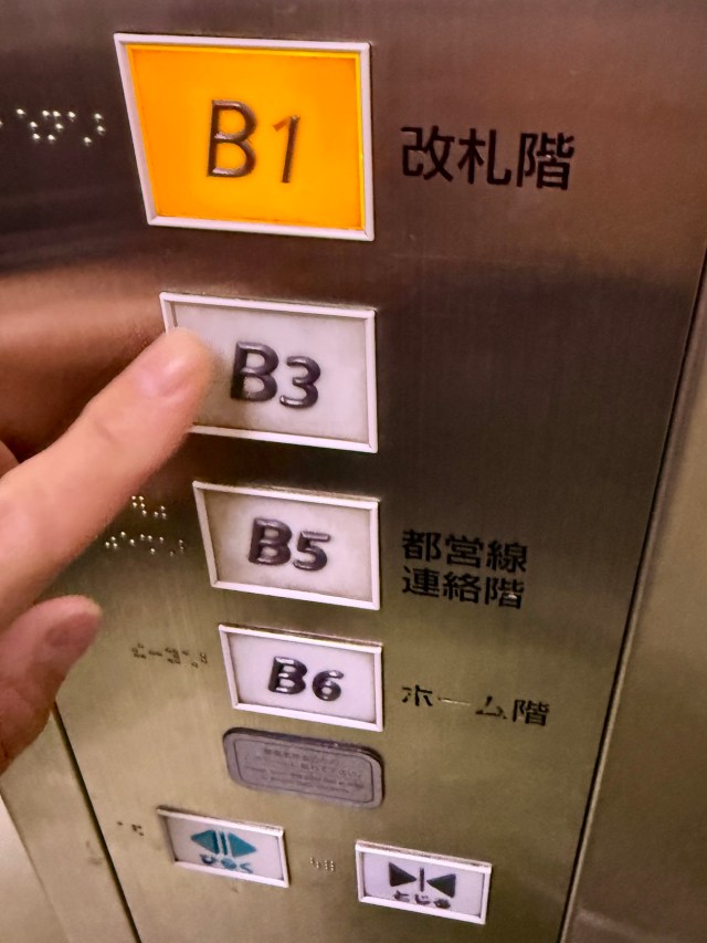エレベーターに乗り込んで操作パネルを見てみると……B1(改札階)、B5(都営線連絡階)、B6(ホーム階)などと並んで、たしかに「B3」のボタンが存在していた。ただし行先の説明はどこにも書かれていない。気になる。