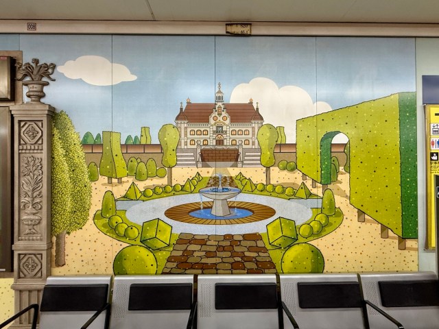 後楽園駅に到着。丸ノ内線のホームを歩いていると、壁一面にドラクエの城のような絵が描かれていた。もしかして「冒険の始まり」ということだろうか。この先、困難や危険が待ち受けているかもしれない。