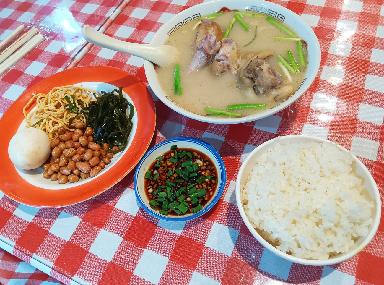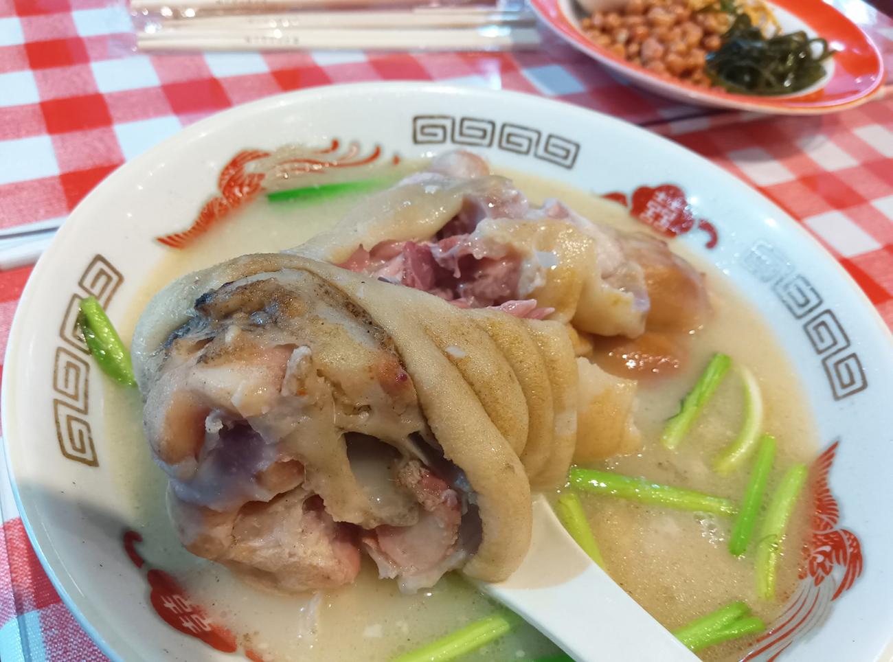 ランチメニューによると、最安は980円の「酸辣土豆丝(サンラートートースー)」。でも、これはじゃがいもの千切り炒めでランチのおかずというよりおツマミ感があるから、1080円で定番と書かれている豚足スープを注文した。