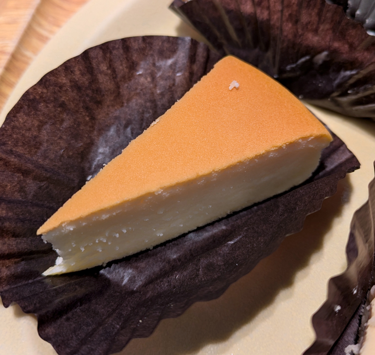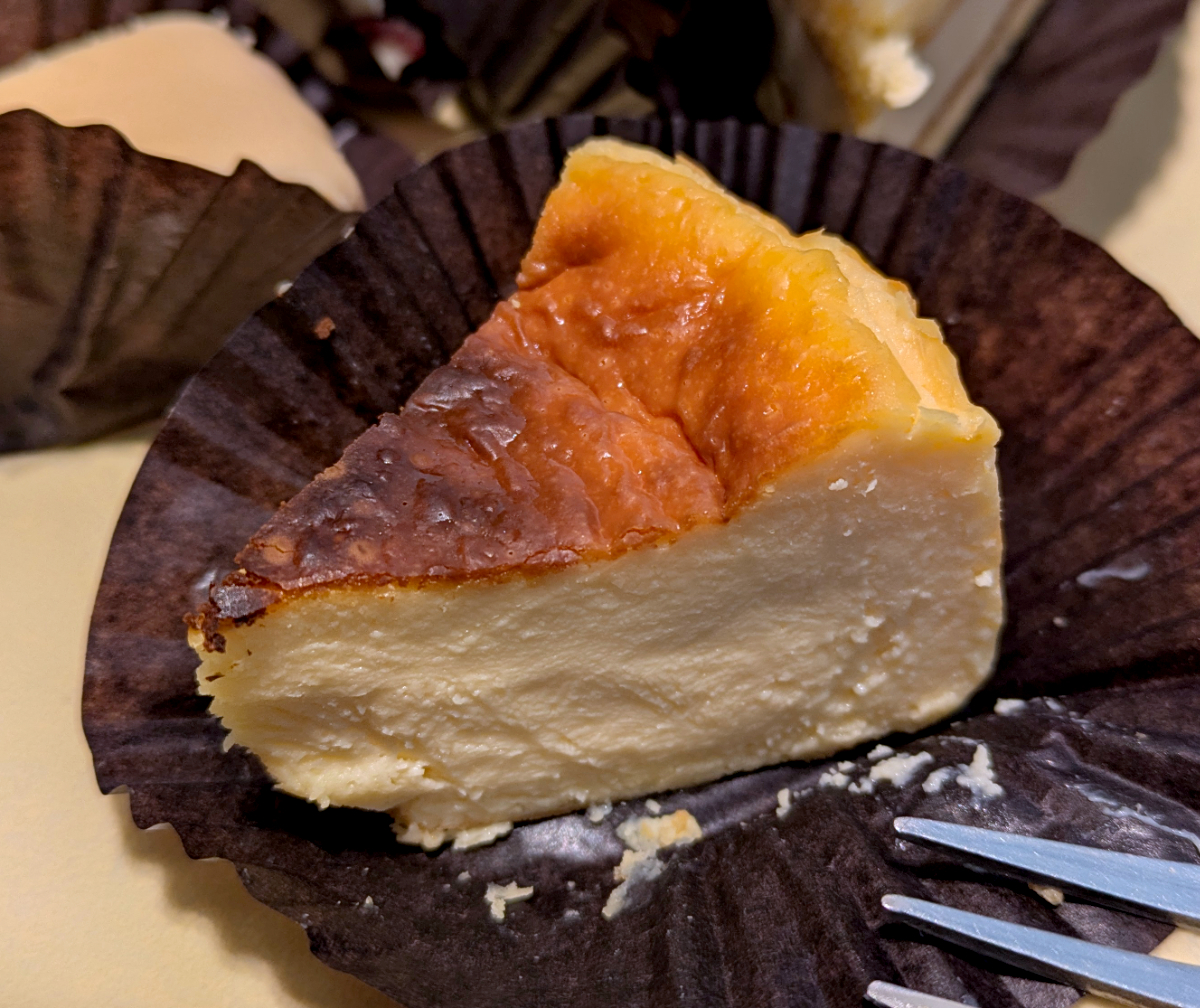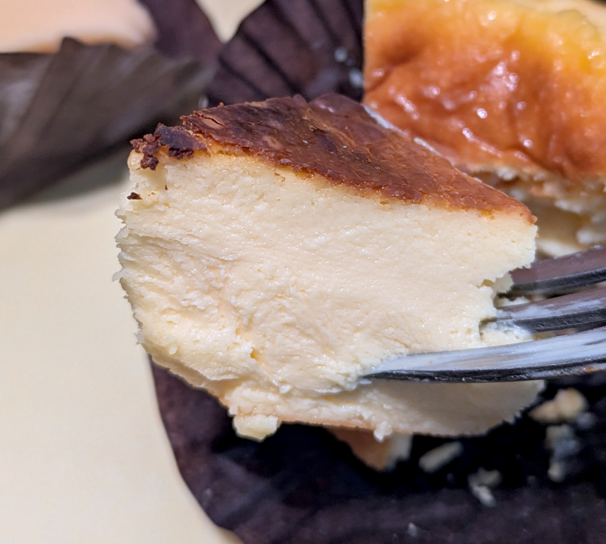 続いて「バスクチーズケーキ」。御用邸ケーキにも増して濃厚でどっしりとした食感。生地のしっとり感は、こちらの方がはるかに上、口に入れると生地が口中にまとわりつく。良い意味で「いけないもの」を食べている背徳感を得られる。