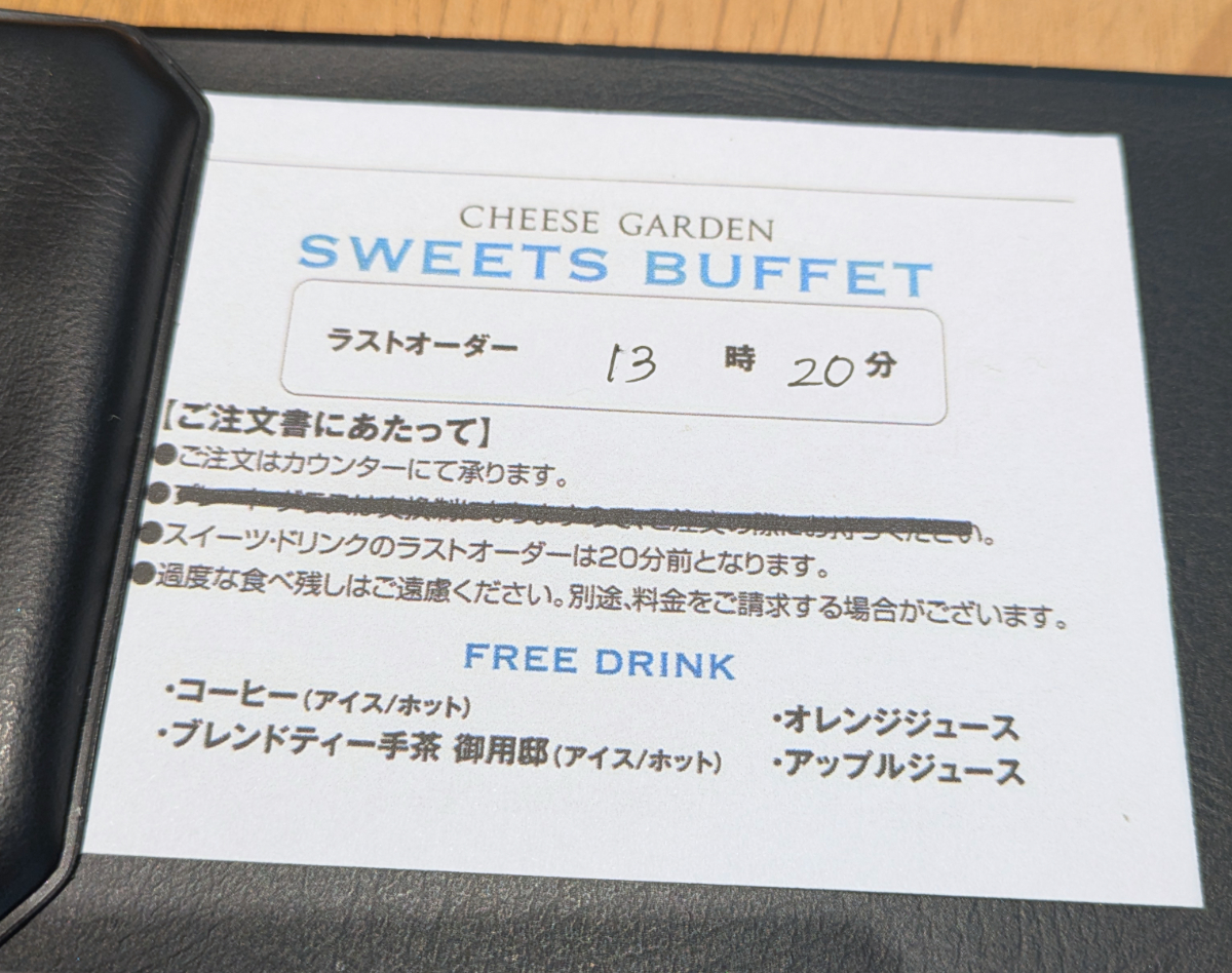 フリードリンクはコーヒー・ブレンドティー・オレンジジュース・アップルジュースの4種類。1度に頼めるのは6品で、同じスイーツは1度に2個しか頼めない。……とまあ、良識の範囲で利用する分には何も問題ないだろう。