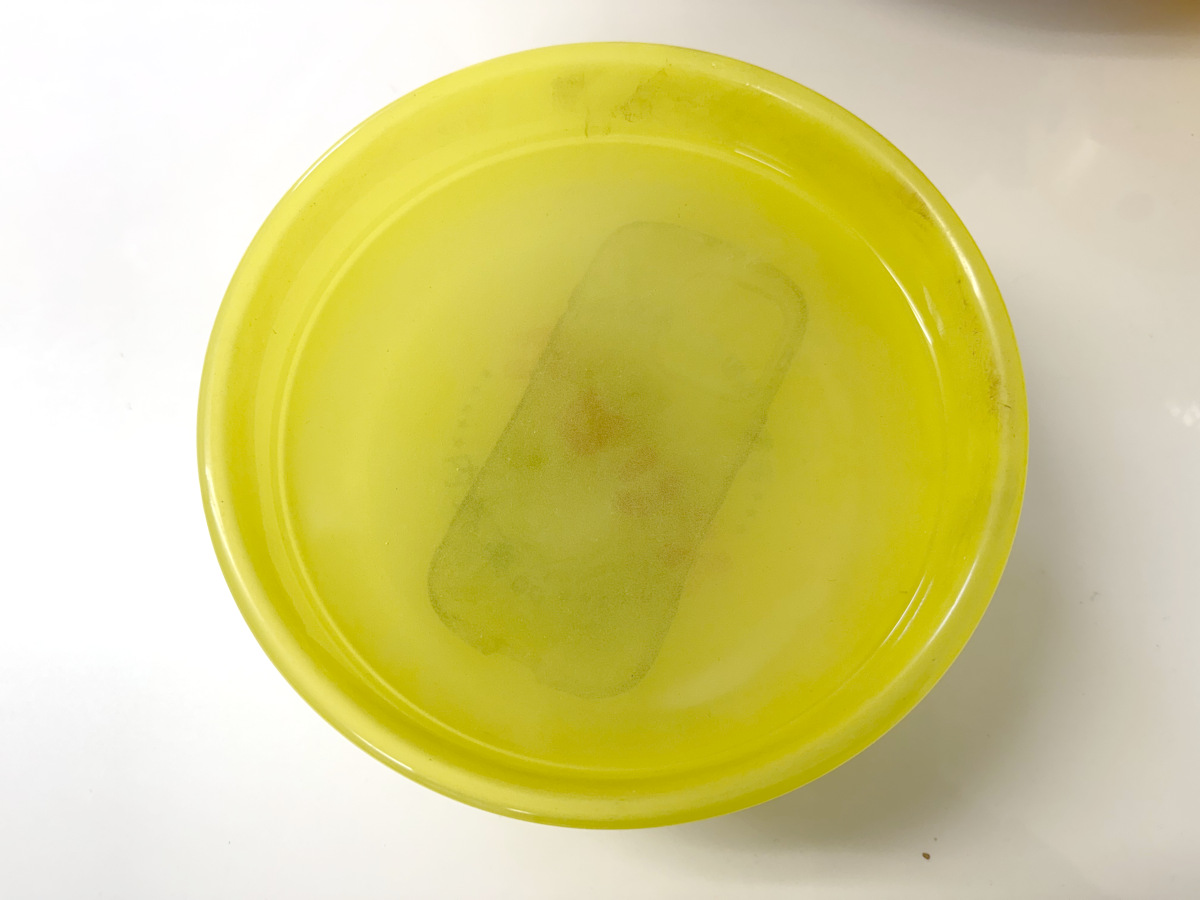 過去のスニーカー等は溶液が黒々としていたが、今回は溶液の色が変わった気配はない。スマホケースを取り出してよく水洗いし、乾かしてみたところ……