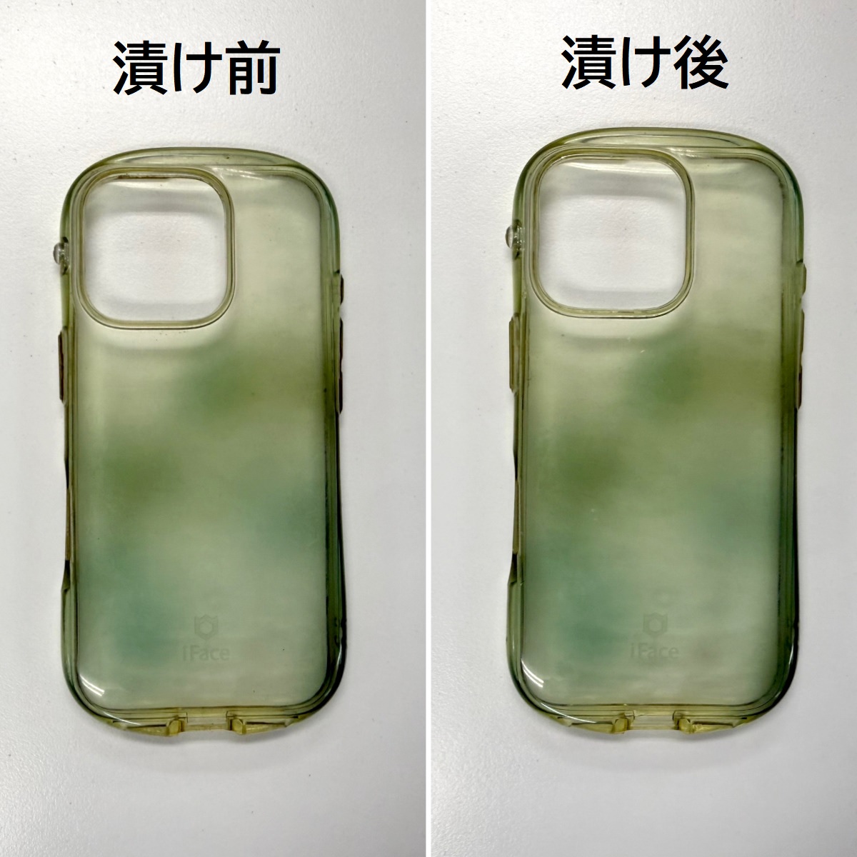 もちろんヒドくはなっていないものの、どれだけひいき目に見たところで「キレイになった!」とは言い難い。結果的に「TPU素材の黄ばみ(変色)にオキシ漬けは効かない」と言えそうだ。