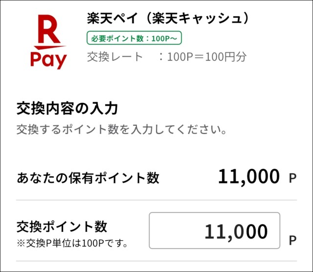 交換レートは100ポイント=100円相当。私は「楽天ペイ」ユーザーなので、全額を「楽天キャッシュ」に交換することにした。