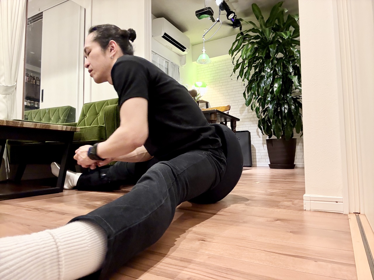 いろいろ座り方や角度を調整して試してみたが、やっぱりスポ〜ン……。これでは柔軟どころの話ではない。
