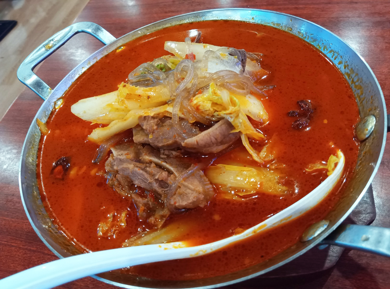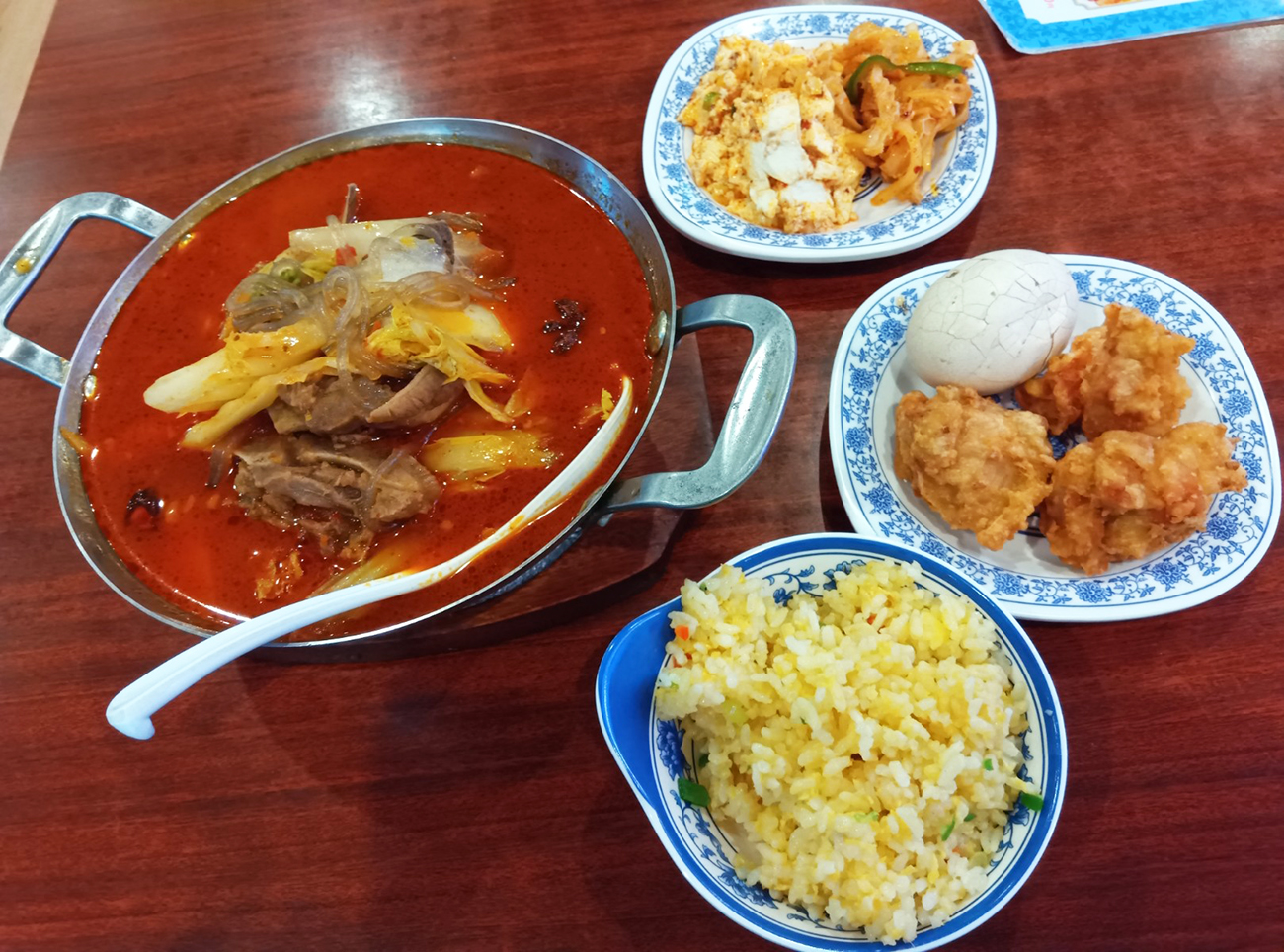 最安のメニューには麻婆豆腐とかエビチャーハンなどの見慣れたメニューもあるけど、せっかくだからマーラー羊背骨鍋定食を注文してみた。最安メニューにマーラー羊背骨鍋という特徴の塊みたいなメニューがラインナップされているのは熱いのではないだろうか。