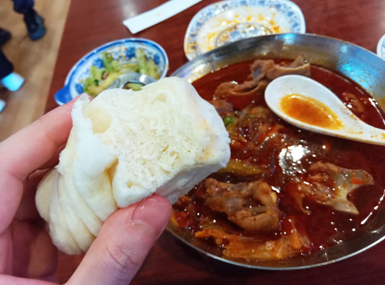 食べてみての感想としては、マーラー羊背骨鍋はかなり辛めだけど、舌の痺れは池袋中華街のガチシビ辛店と比べるとそこまで高くないと言えるだろう。羊の旨みが染み出した止まらない系のピリ辛なので、甘めの蒸しパンとの相性が良かった。