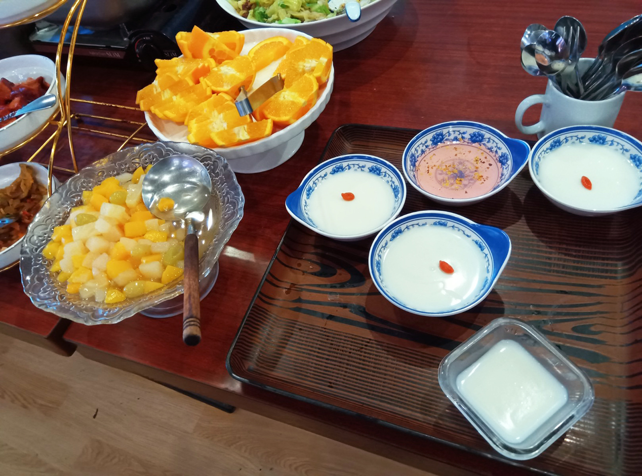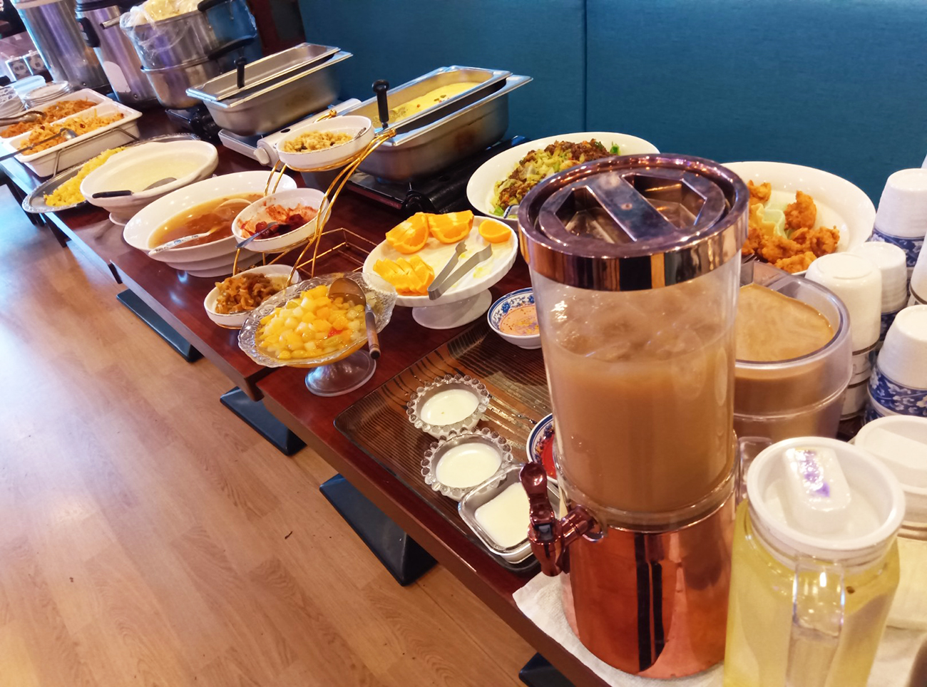 ビュッフェのレベルが副菜ではない。鶏の唐揚げ、炒飯、麻婆豆腐とメインメニュー級が揃っているばかりか、デザートも杏仁豆腐だけじゃなくフルーツポンチとかある。さらには、チャイまでラインナップされていた。食後も充実の内容である。