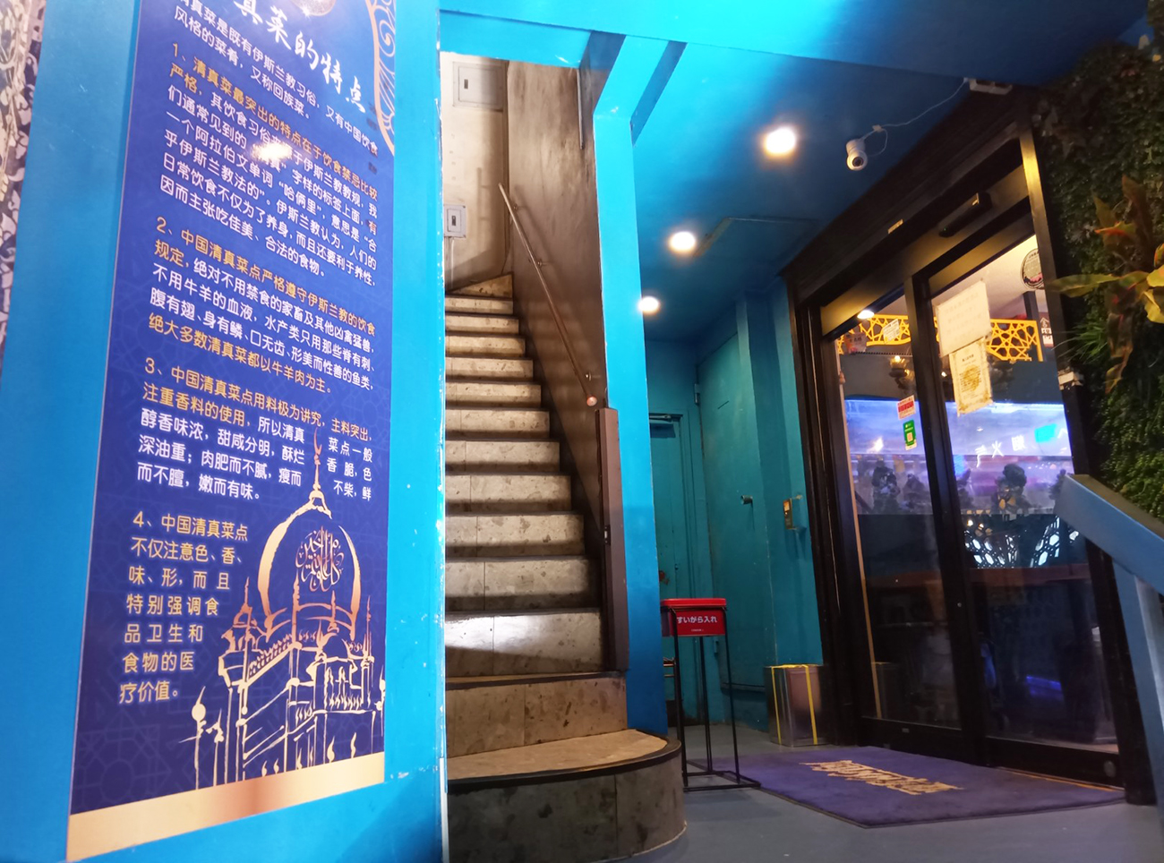 ビルの外側の2階部分も看板と同じ水色に染められているためすぐ分かった。遠くからでも一発で分かる思い切った配色と染めっぷりと言えよう。っていうか、ビル入口の2階に上る階段からすでに水色の世界観が始まっている。何の店か分からないレベルの思い切り方だな。