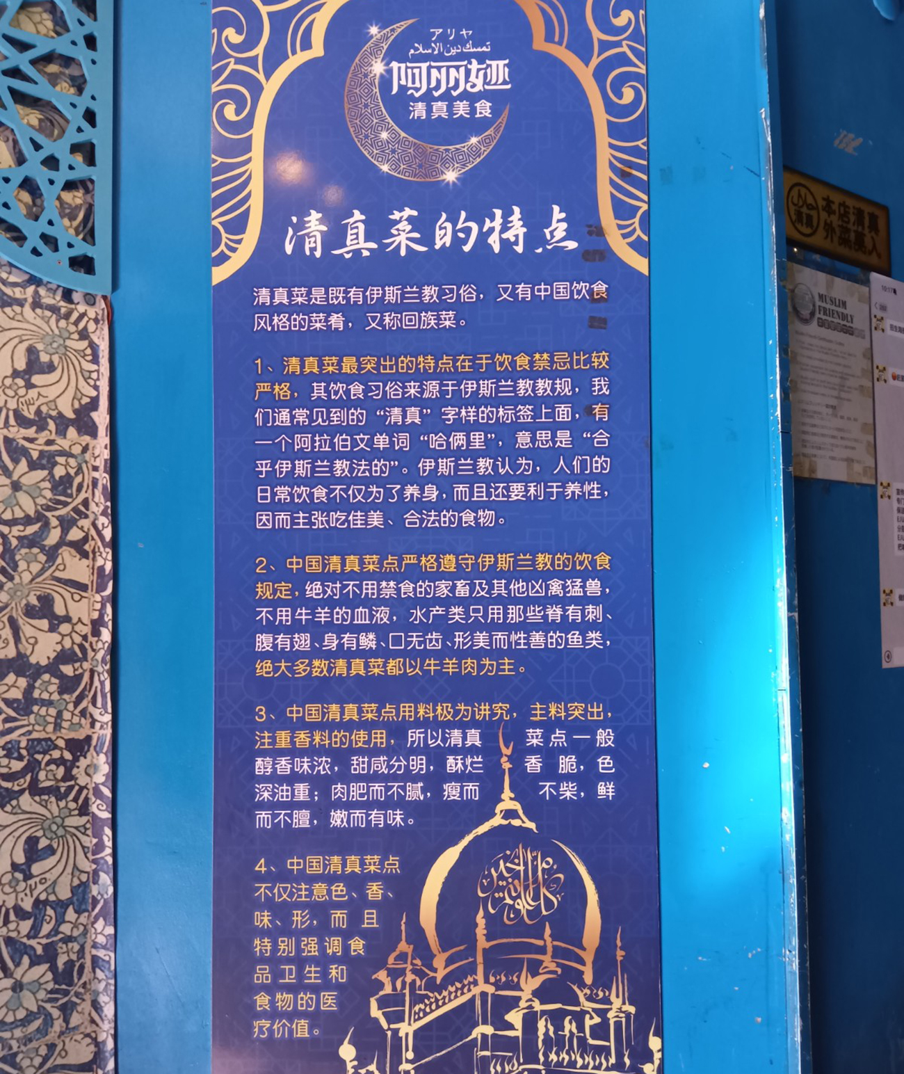 どうやら「回族料理」の専門店のようだ。説明文によると、中国のハラール料理で、イスラムのならわしと中国の料理スタイルが組み合わされたものなんだそうな。確かに「回族」をGoogleで検索すると、中国最大のムスリム民族集団という説明が表示される。