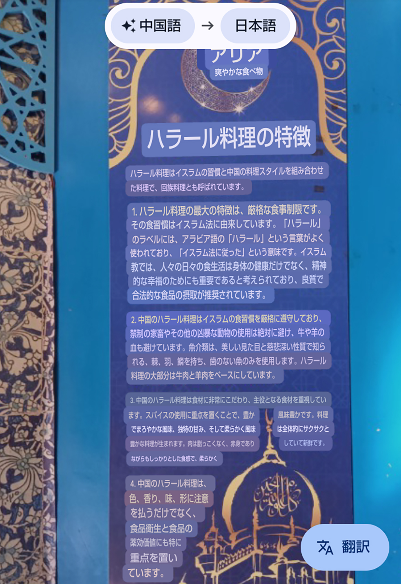 階段を上ると、何かの説明が長々と掲示されているんだけど、これも完全中国語でなんて書いてあるのか不明。店名だけにはカタカナが振られているため、店の名前が『アリヤ』であることだけは分かった。アリヤは我々に何を伝えようとしているのか? 気になるのでこの中国語の説明文をGoogleレンズで翻訳してみたところ……