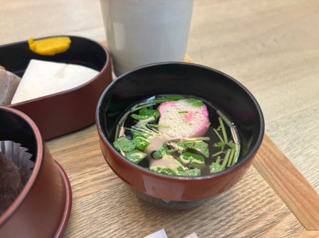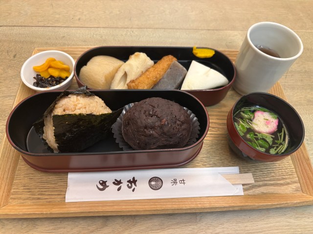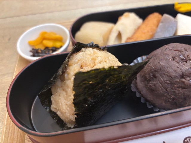「弁当」の名の通り、2段の弁当箱におでん、茶飯のおにぎり、おはぎが入り、さらにお吸い物と漬物までついてくるという至れり尽くせりのセット!