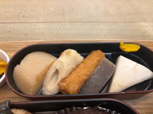 おでんの具ははんぺん、たまご、昆布、大根、豆腐、ちくわ、こんにゃくと至ってベーシック! からしもしっかりついている!