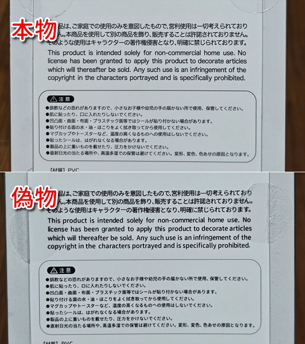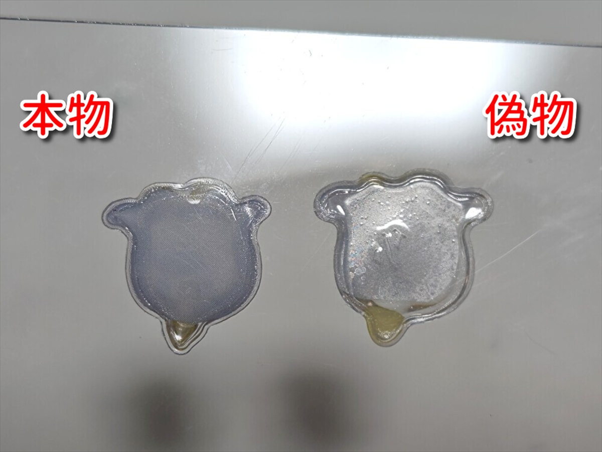 ▼本物と偽物を見分けるポイントもご紹介しよう。一番わかりやすいのは裏面の文章。本物は文字間のスペースが整ってキレイだが、偽物はフリーフォントをそのまま使ったようにガタガタしていて汚い