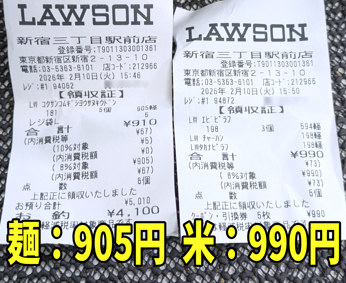 購入額は税込905円(+袋代5円)のみだ。冷凍米飯は各198円で5個で合計990円、無料で手に入れた金額の方が購入金額を上回るという、謎の逆転現象が起きてしまった。