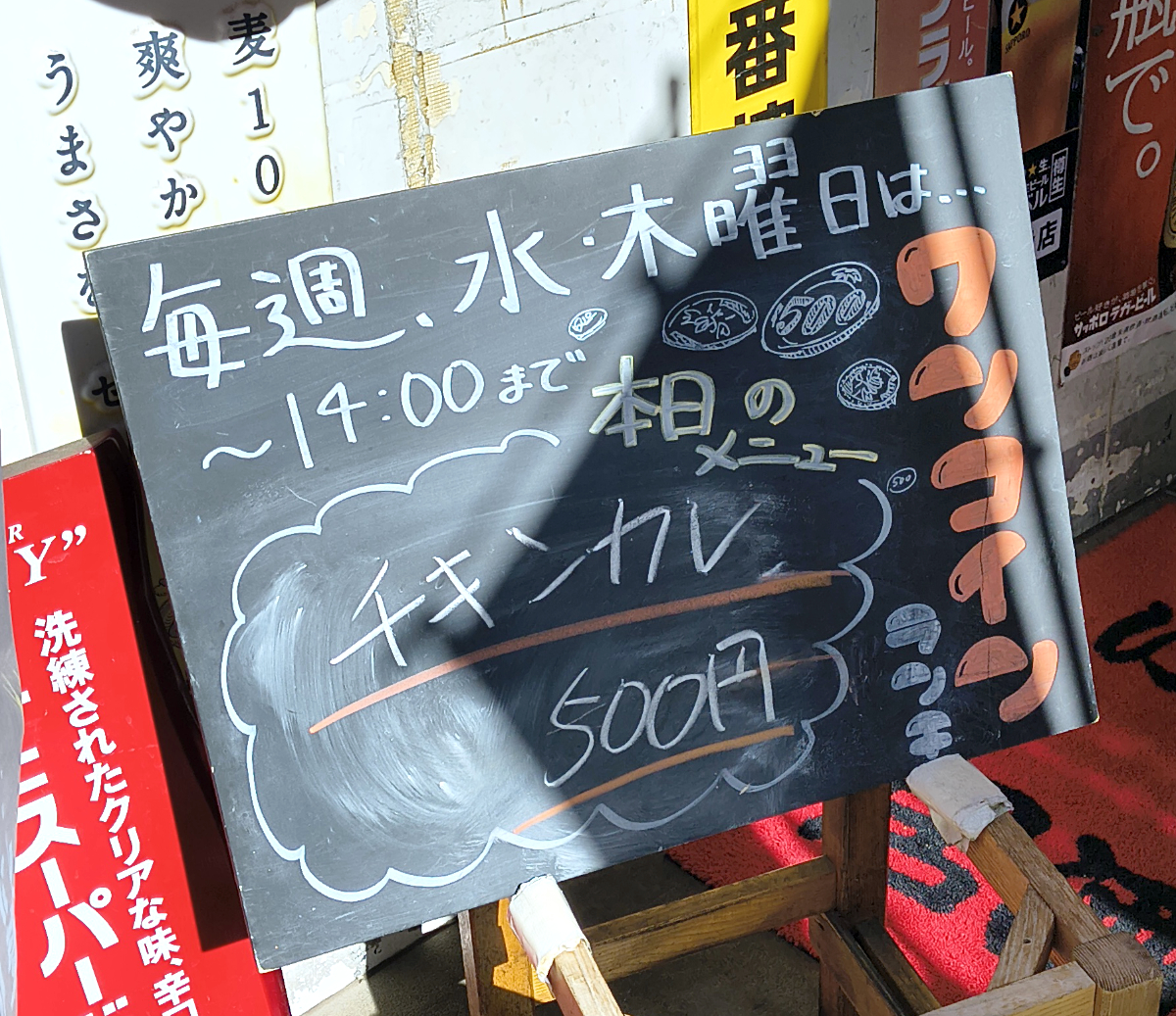 「毎週水・木曜日はワンコインランチ チキンカレー500円」