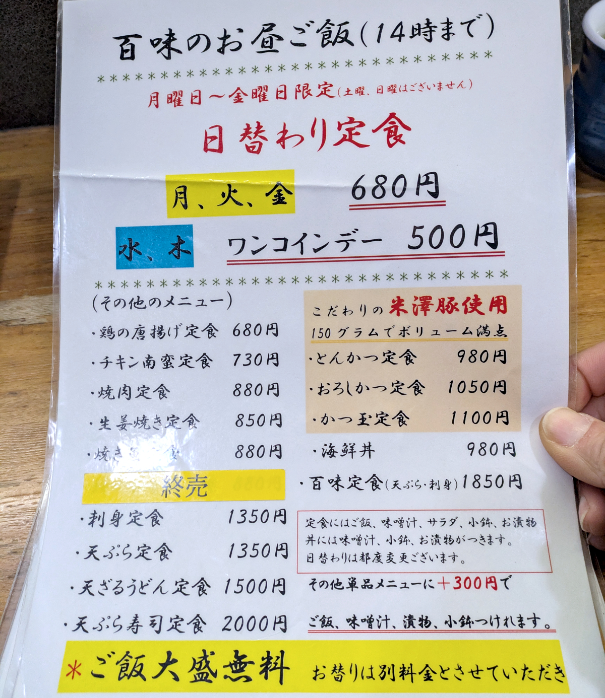 さて、私は着席と同時にワンコインの日替わりを頼んだが、ほかのランチメニューを見てみると……。