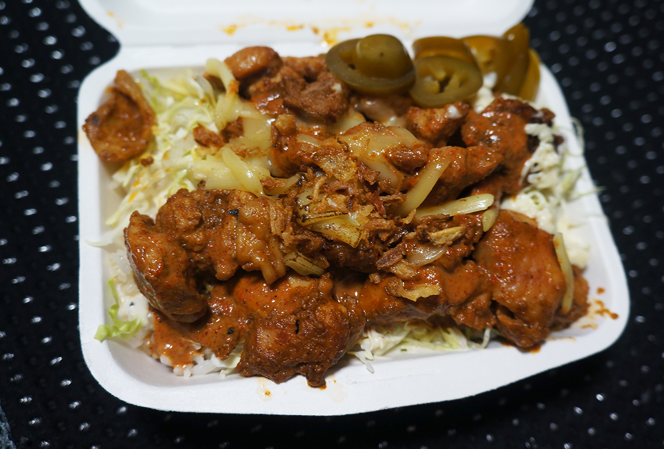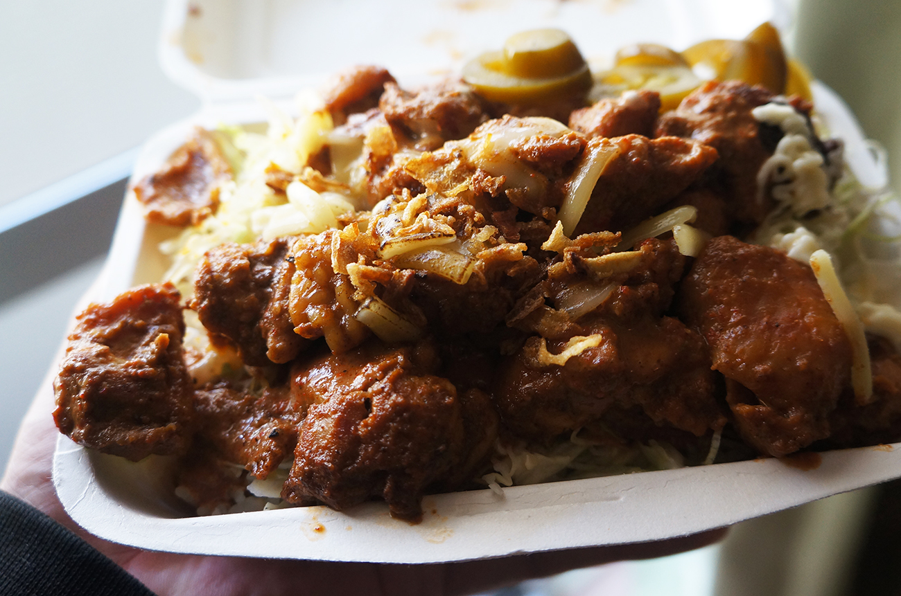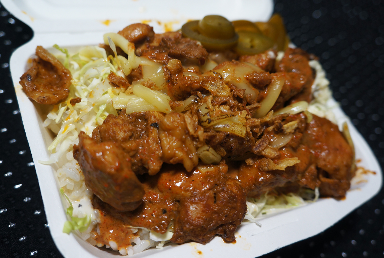 ゴロゴロしたチキンは細切れのケバブとは違うジューシーな肉の柔らかさが感じられる。酸っぱ辛いだけじゃなく豊潤なまろやかさのあるソースがその肉感を活かし、ケバブ屋で食べるケバブ丼より米に合っている気がするのだ。