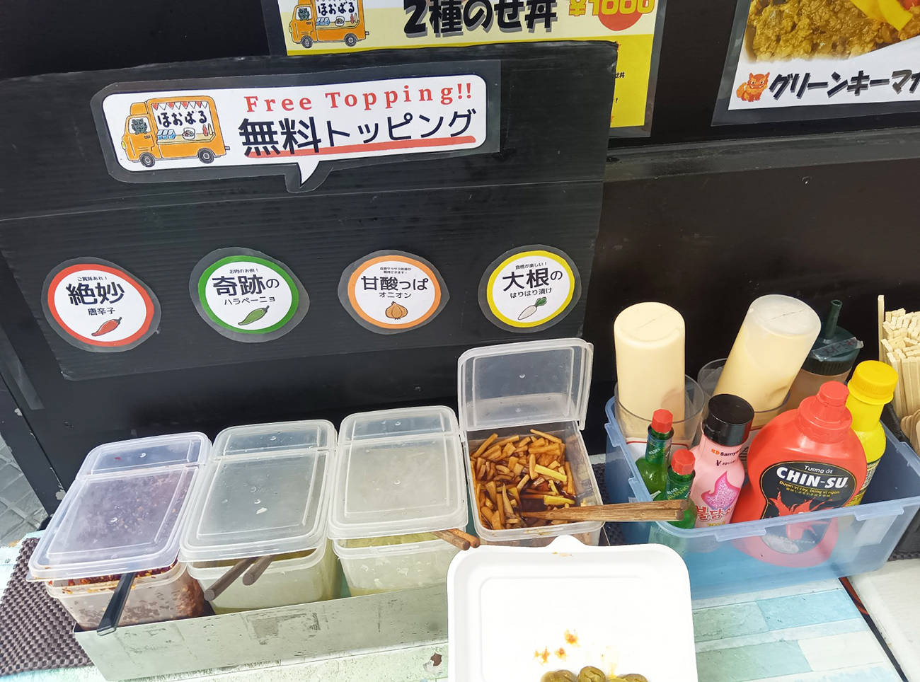 その上、無料トッピングコーナーがあって、そこにはマヨネーズやスイートチリソースなどのソース類から、唐辛子、ハラペーニョ、甘酸っぱオニオン、大根のはりはり漬けまでがラインナップされている。ゆえに、キッチンカーでも1食の満足度が高い。