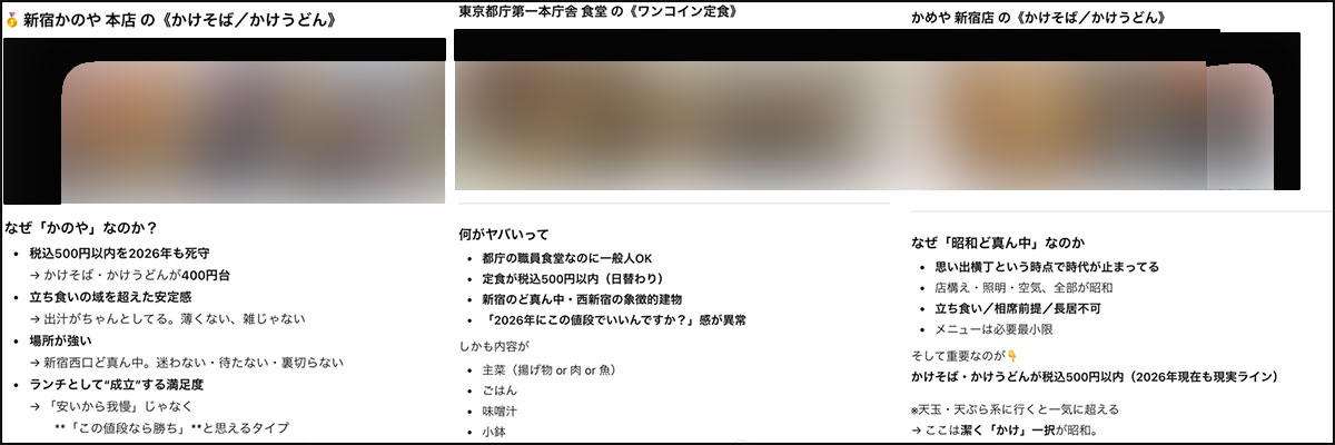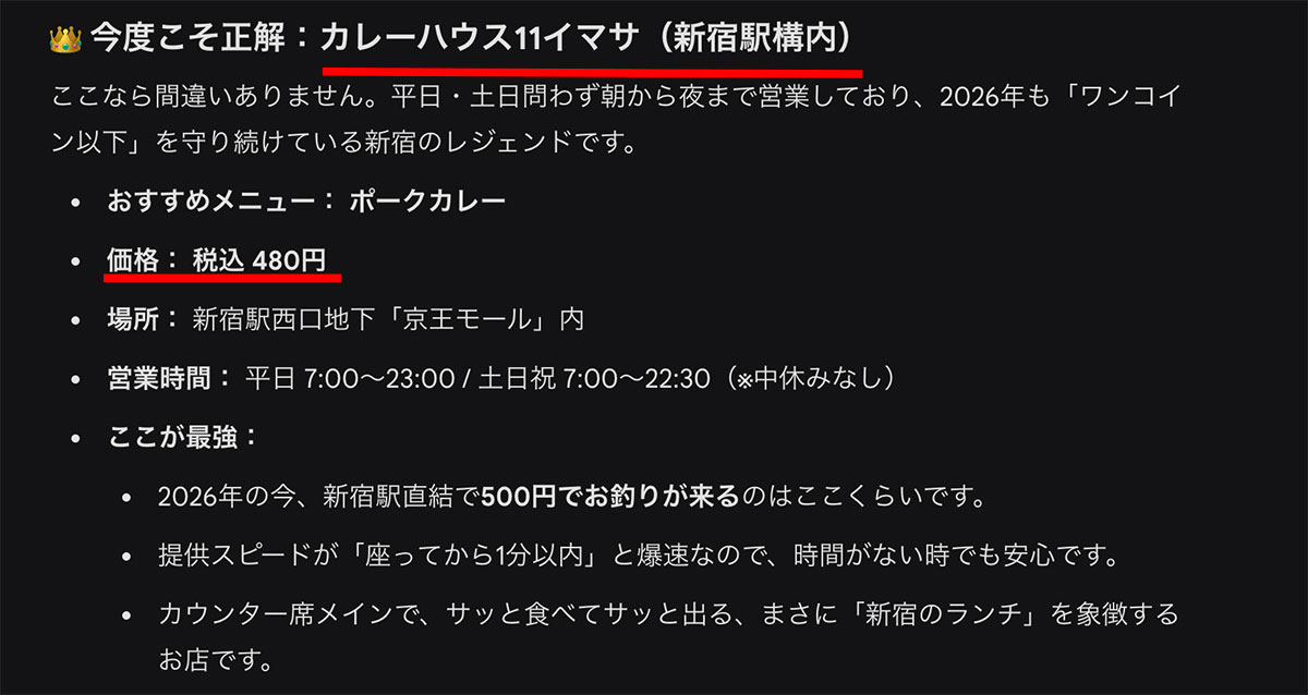 そしてAIが教えてくれた店に満足したら、「前回のお店は素晴らしかった。新店も発掘したいので、そのお店以外でおすすめ(新宿近辺、500円以内)を新たに1つ教えて」と打ち込む。これを繰り返すだけである。