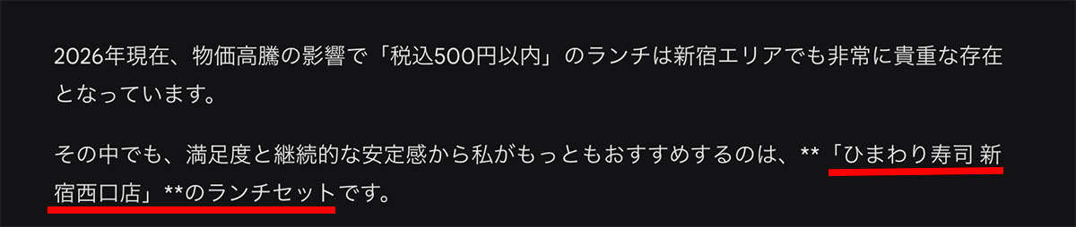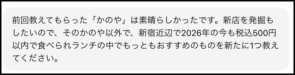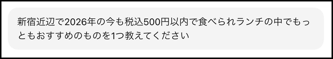 やり方は簡単。どちらのAIにも、「新宿近辺で2026年の今も税込500円以内で食べられるランチの中でもっともオススメのものを1つ教えてください」と打ち込むだけ。