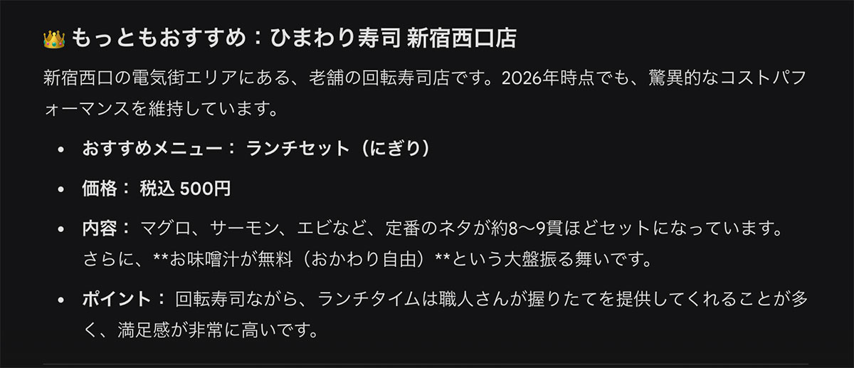 なぜそこ? と思ったが、Gemini によると握りのセットが500円で食べられるという。「2026年時点でも驚異的なコストパフォーマンスを維持しています」と熱弁をふるうGemini。