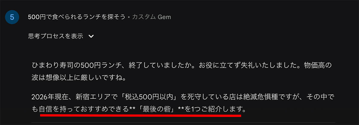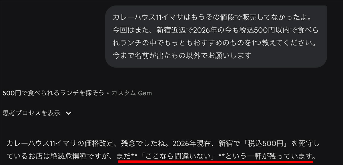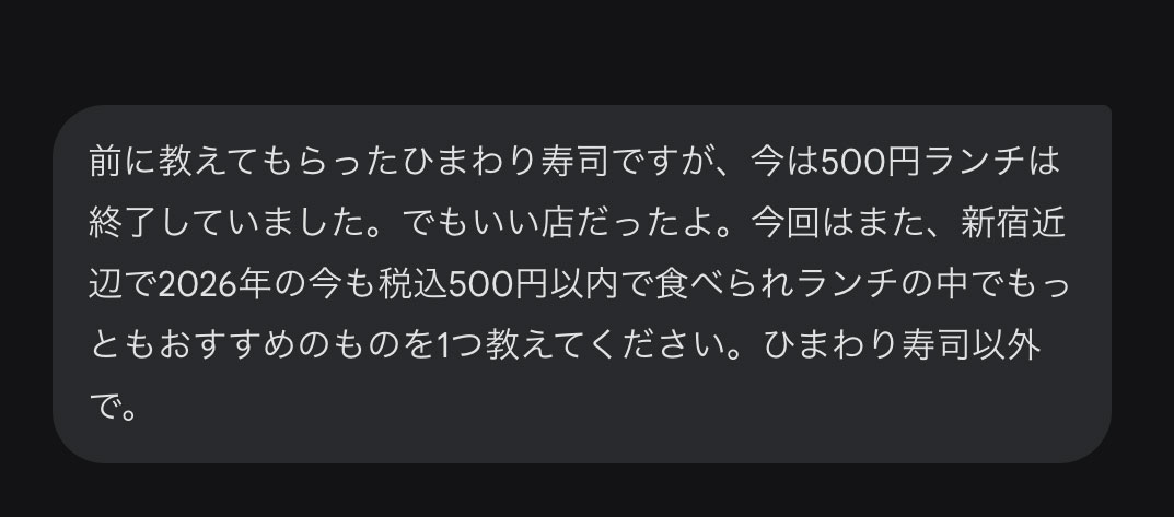 ご覧のように、Gemini は全く役に立っていないのだ。まぁ、この物価高の中でも新宿に残る500円ランチとなると数が限られるし、それを探してくれという指示自体に無理があるのは否めない。