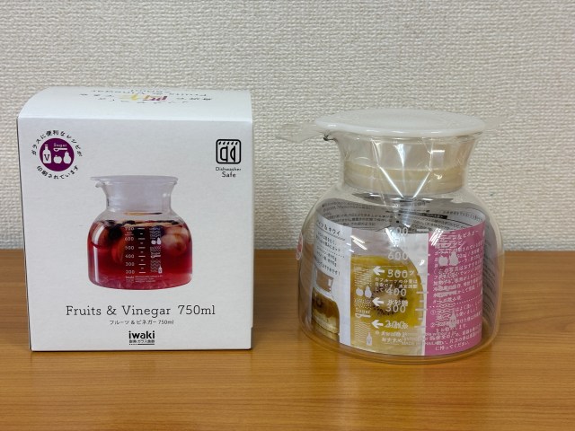 こちらは、ガラスに印刷されているレシピの位置まで酢、砂糖、お好みのフルーツを入れてレンジで加熱するだけでフルーツビネガーが作れる一品。