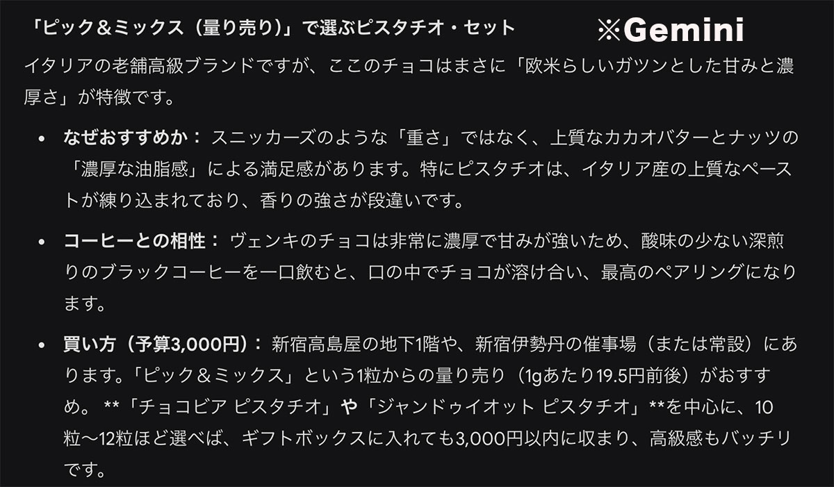 ちなみに、Venchiで何を買うかって話になると、Gemini とChatGPTでは意見が異なる。Geminiは「量り売りのチョコ」をオススメしており、ChatGPTは「ピスタチオ クレミノ バー&70% エクストラダーク チョコレート ミニバー」だった。