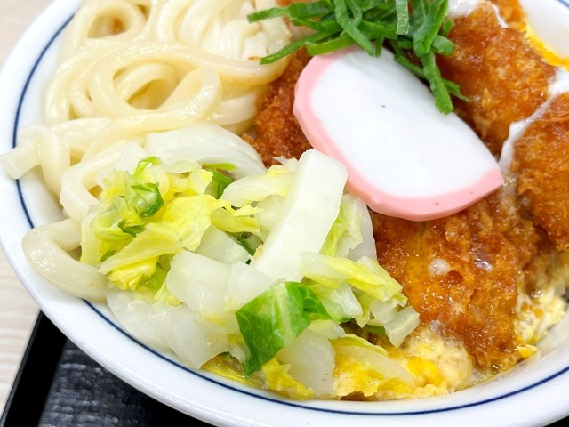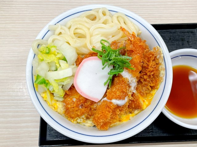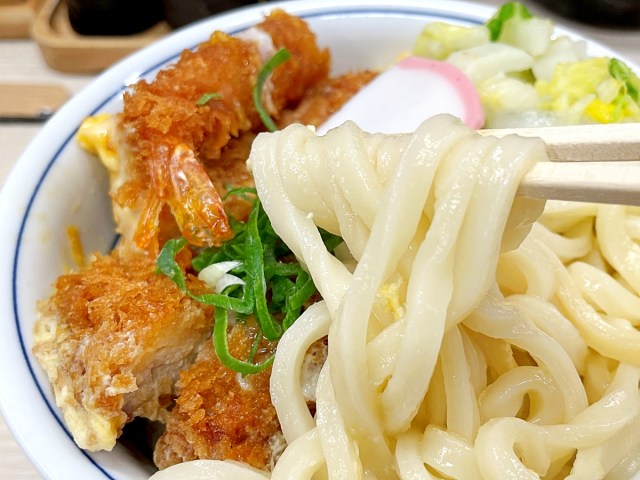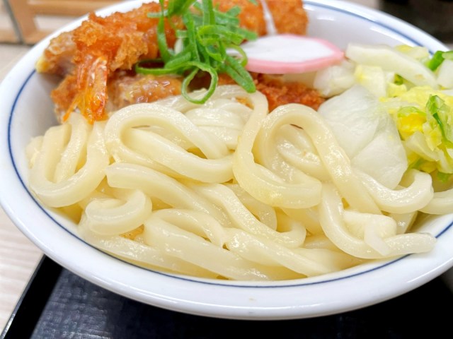 ロースカツ、海老フライ、白菜などに加え、〆(しめ)のうどんがすでに搭載されているあたり、実に「かつや」らしい。ご飯と豚汁(小)がしっかり付いてくるのも笑いを誘う。