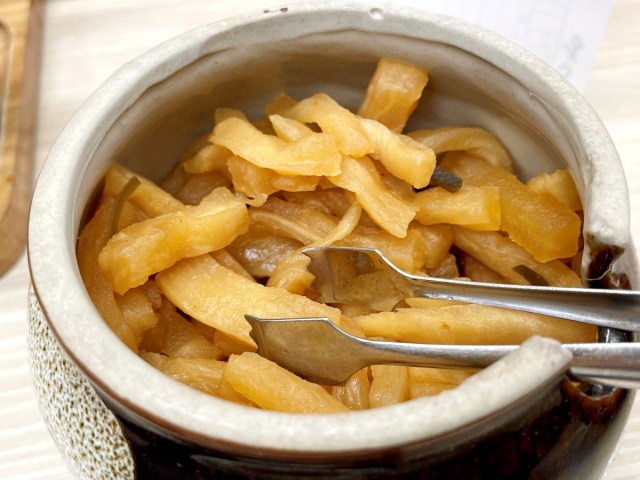 ▼うどんと白菜をタレで食べたため、いつもの期間限定メニューよりもご飯が多く感じられた。そこで役に立ったのが「かつや」が誇る激ウマ漬物である。