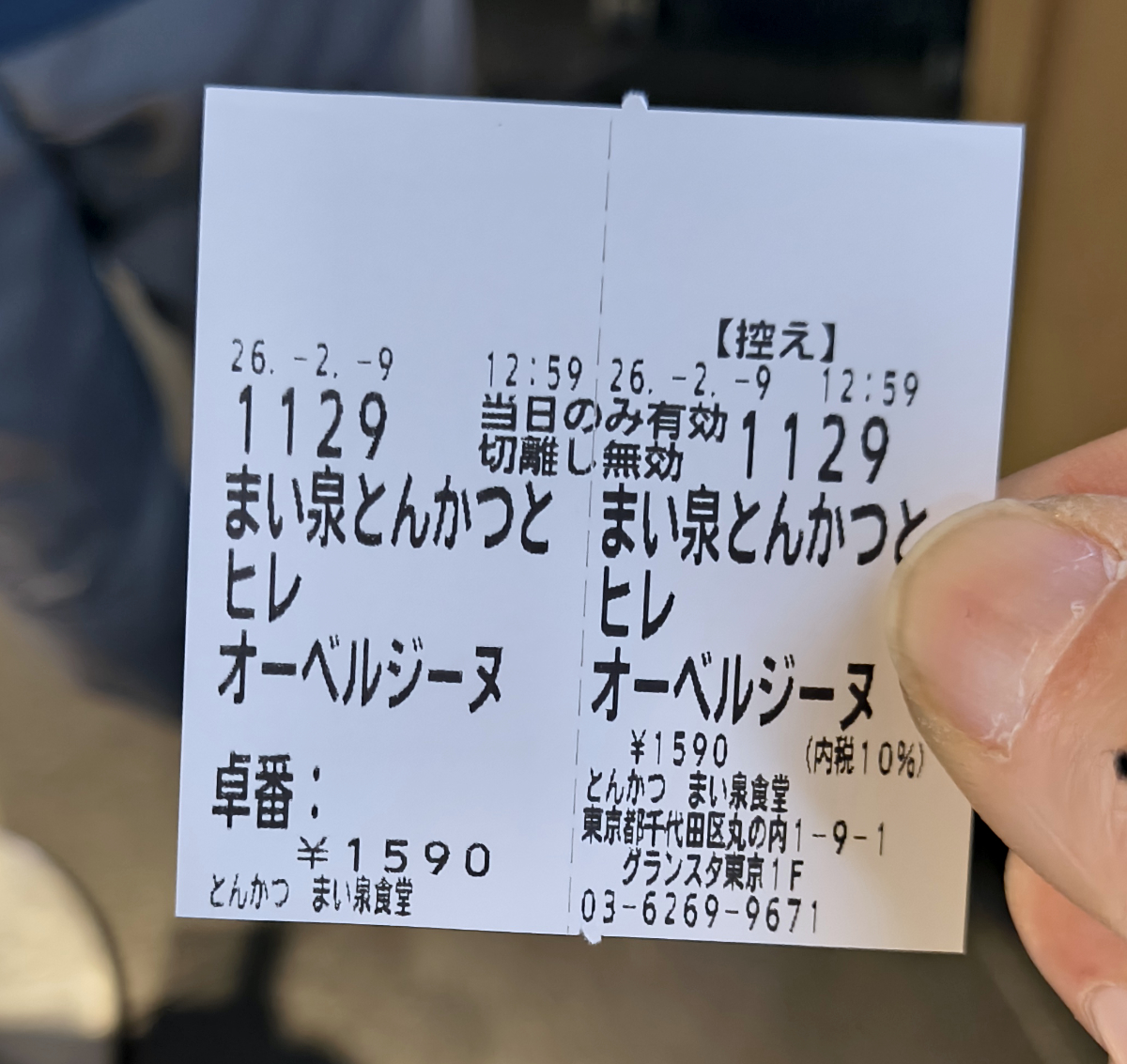 そうして20分ほど券売機の改善を待って、ようやく食券購入。お目当てのメニュー「まい泉 とんかつとオーベルジーヌ欧風カレー」は税込1590円。とんかつはヒレ(65g)かロース(80g)から選べるぞ。